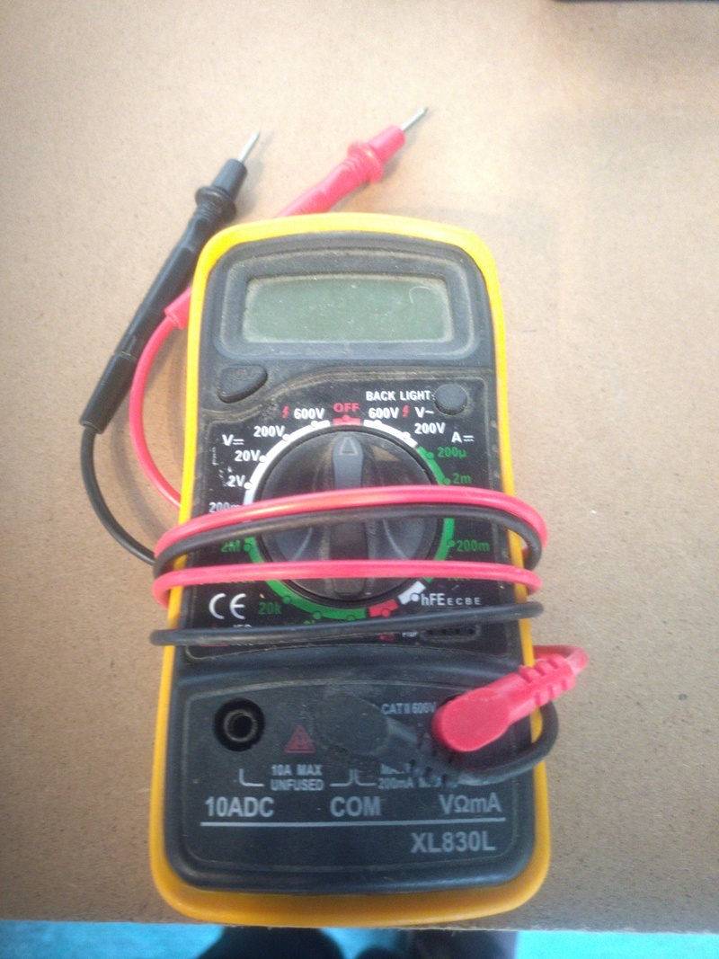 A standard multimeter. Measures amps, volts and all the rest.